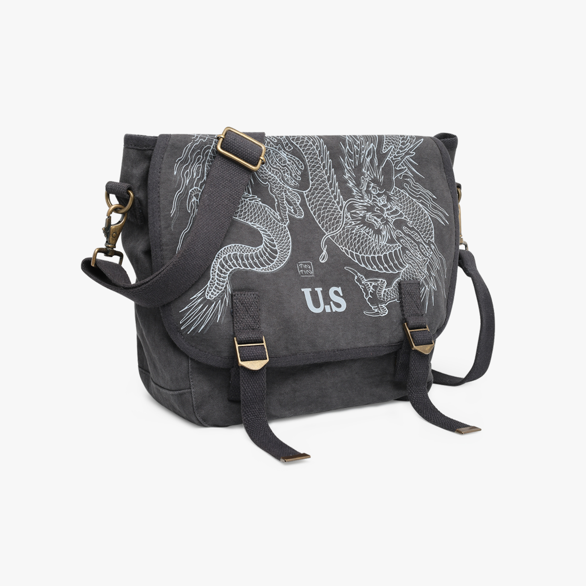 Besace en toile noire avec impression dragon grise sur le rabat et logo au dos , tous deux dessins iconiques de l’artiste.