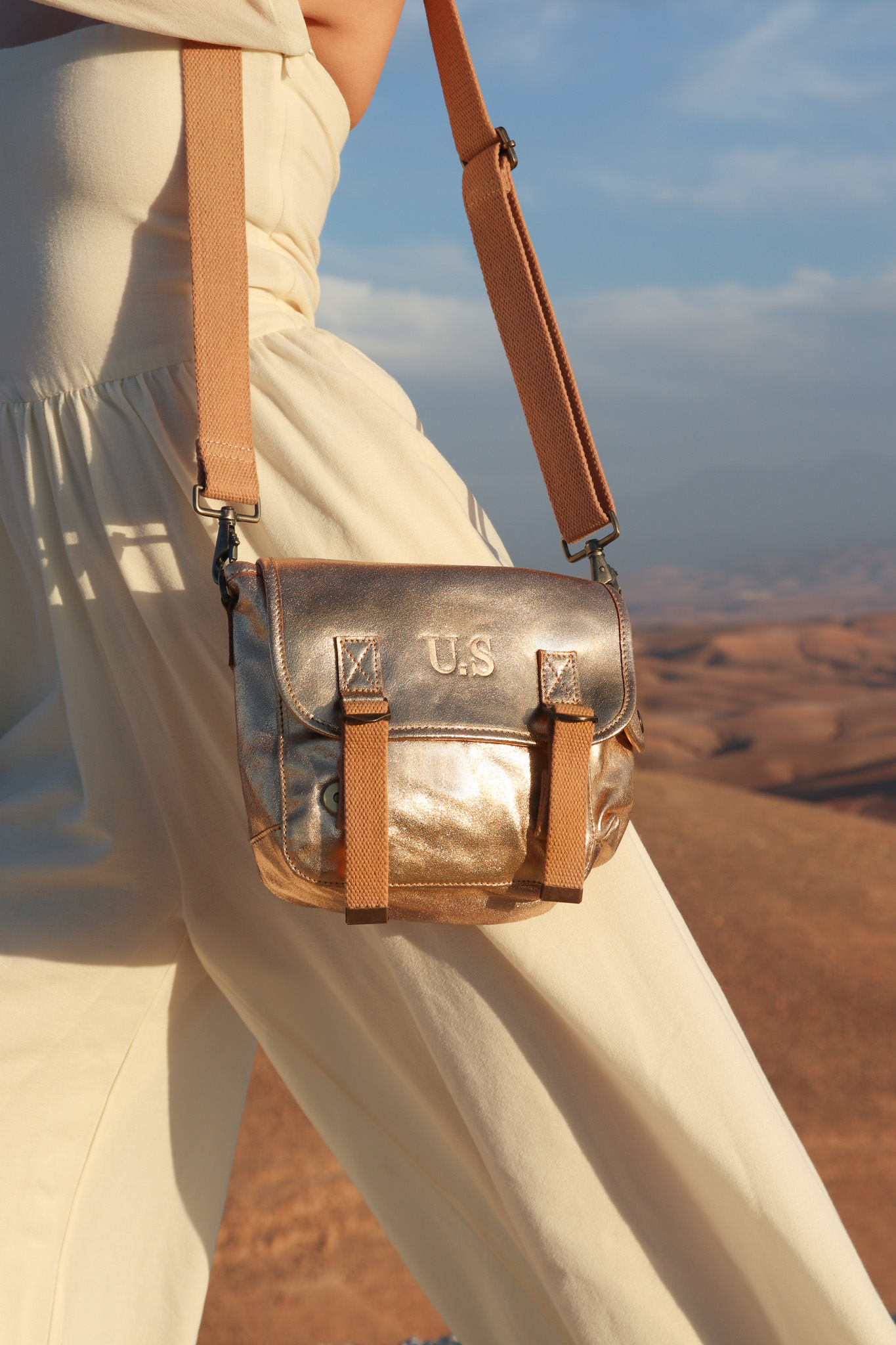 Besace en cuir métallisé doré, garniture en coton ton sur ton. Doublure en sergé de coton bleu marine.