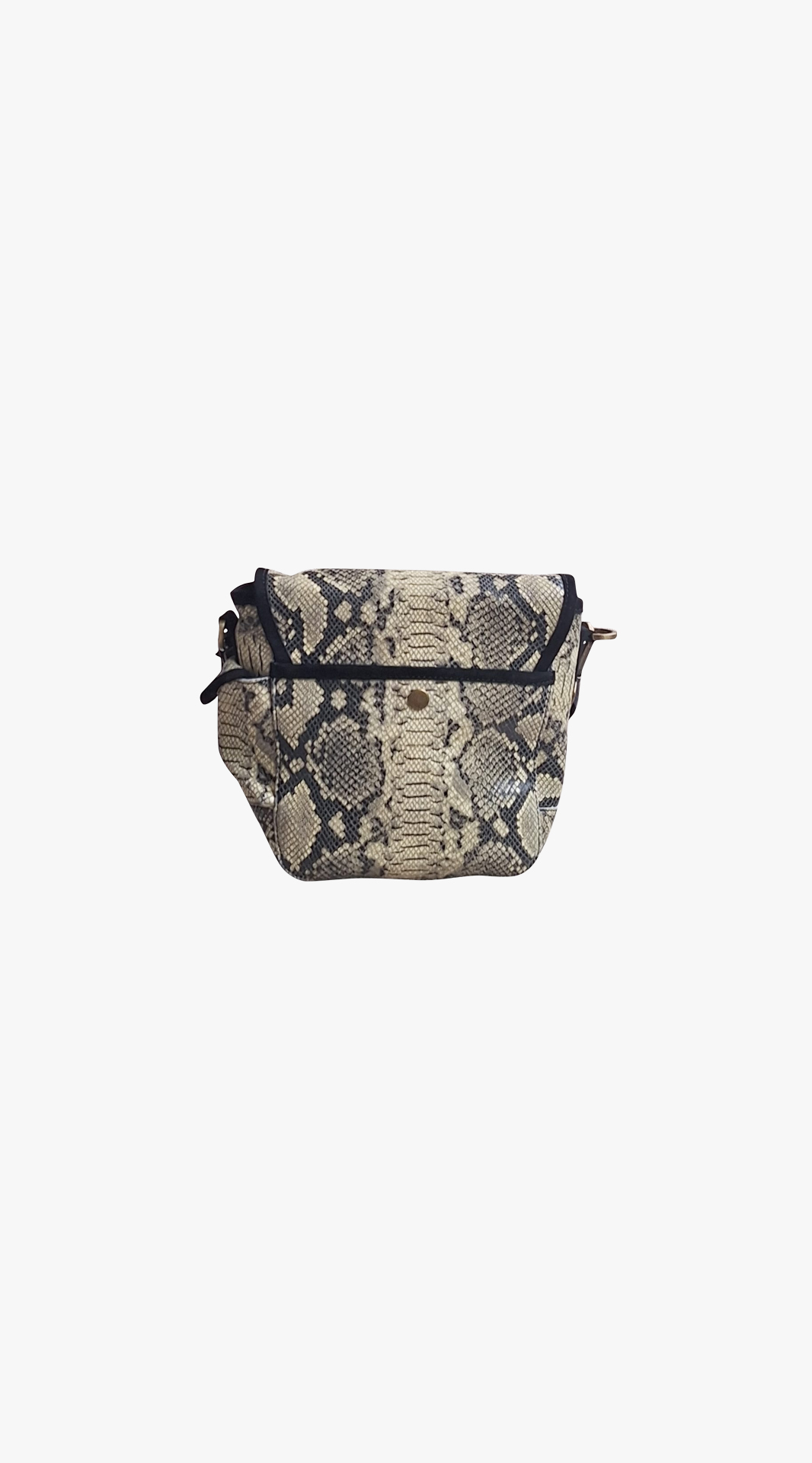 besace en cuir imprimé python, garniture en coton ton sur ton. Doublure en sergé de coton bleu marine.