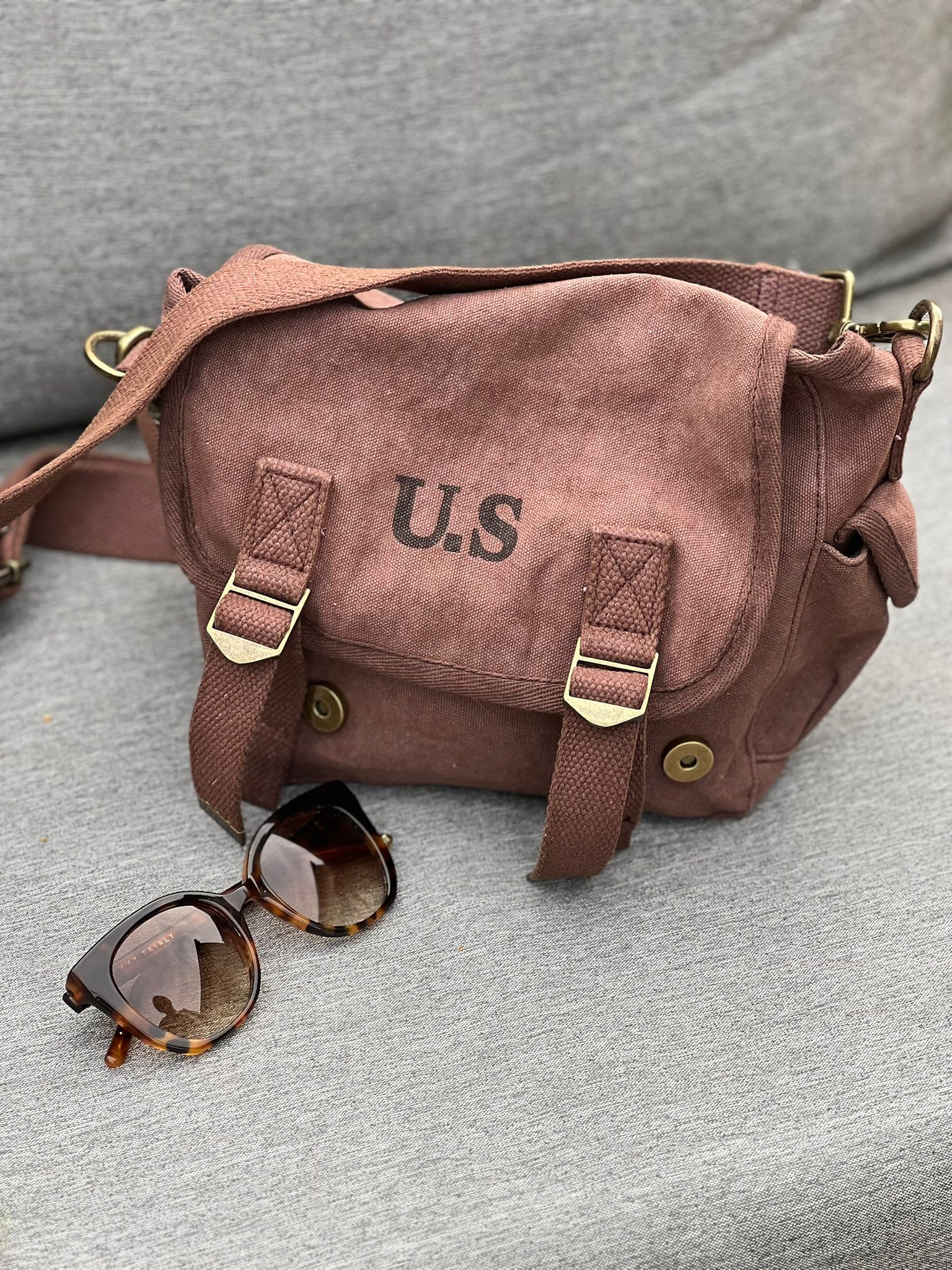 Besace en toile de coton chinée used chocolat, garniture en coton ton sur ton. Doublure en sergé de coton bleu marine.