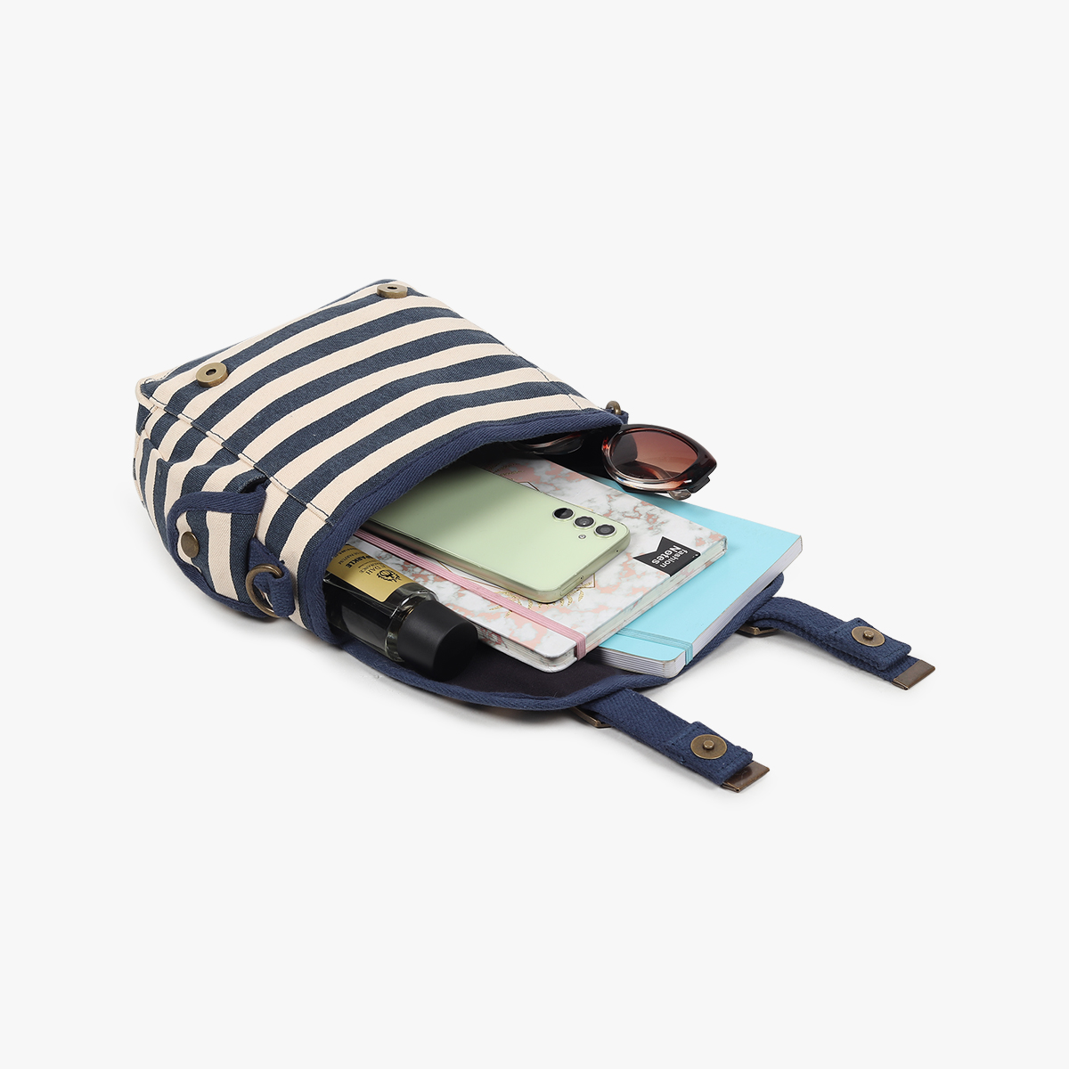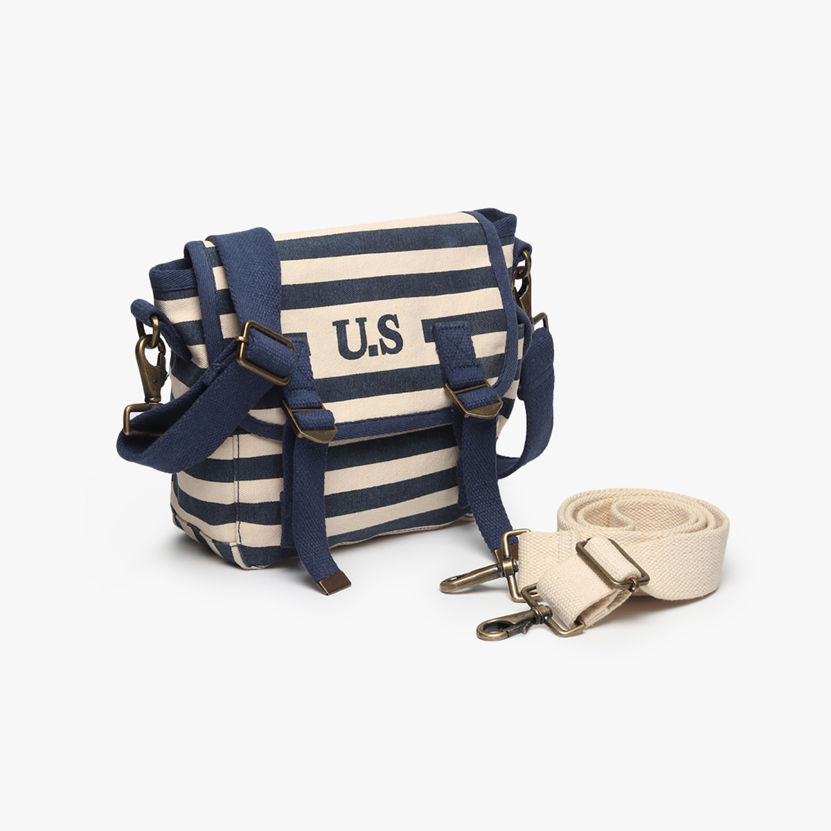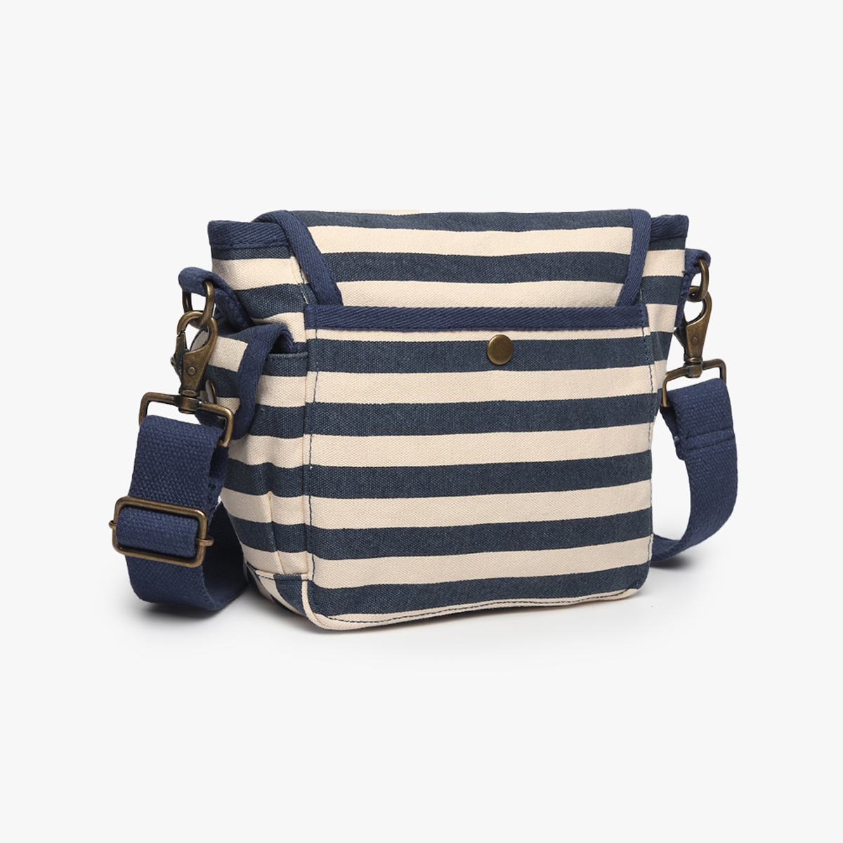 Besace en toile canvas rayée marine et écru, garniture en coton marine. Doublure en sergé de coton bleu marine.